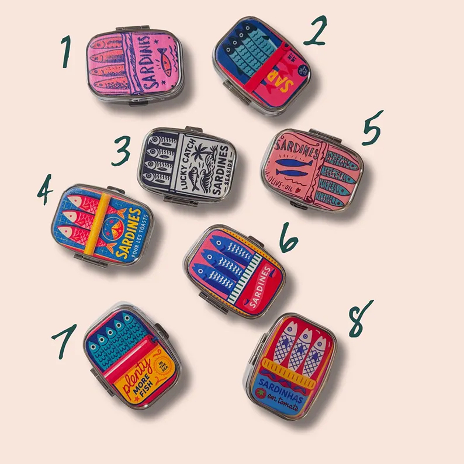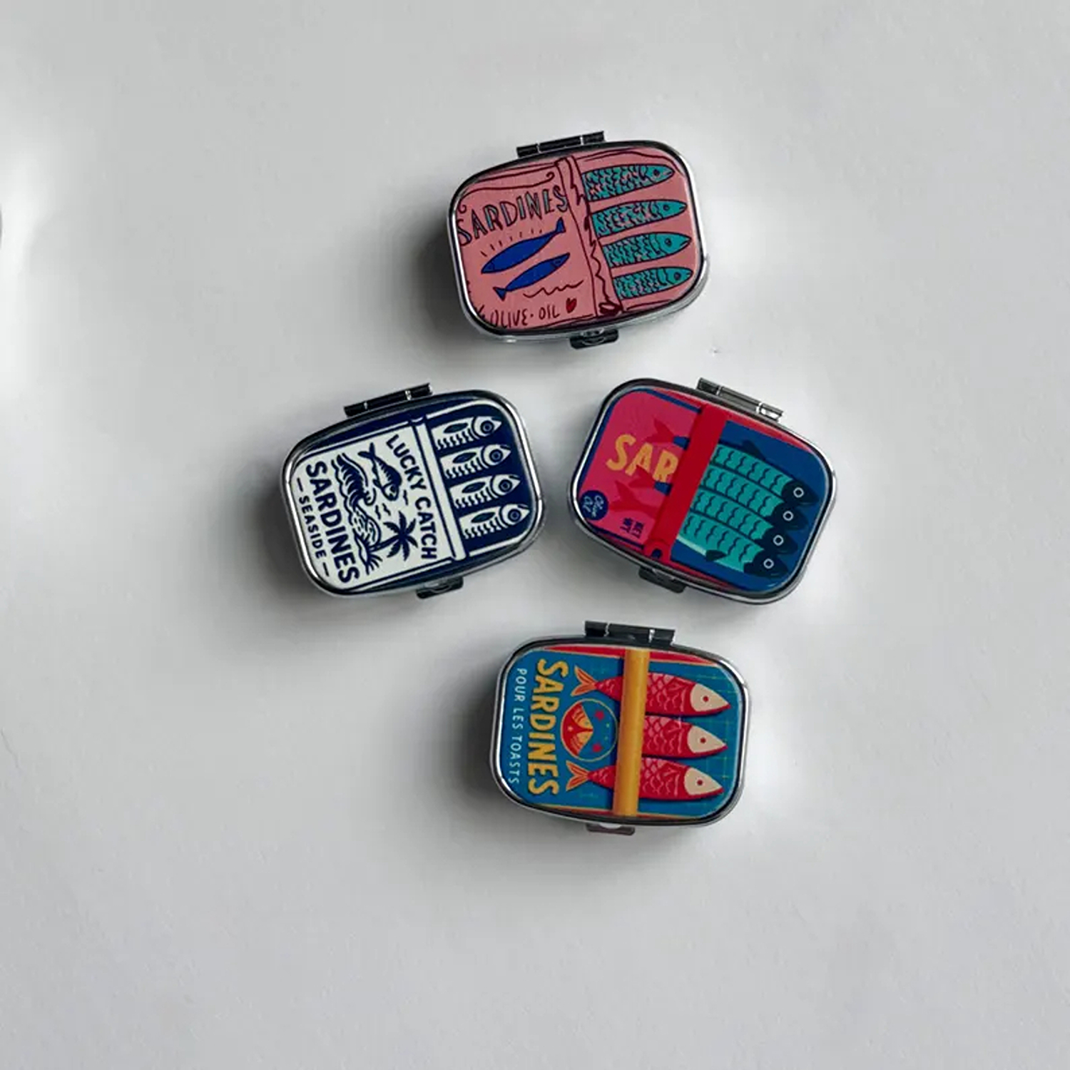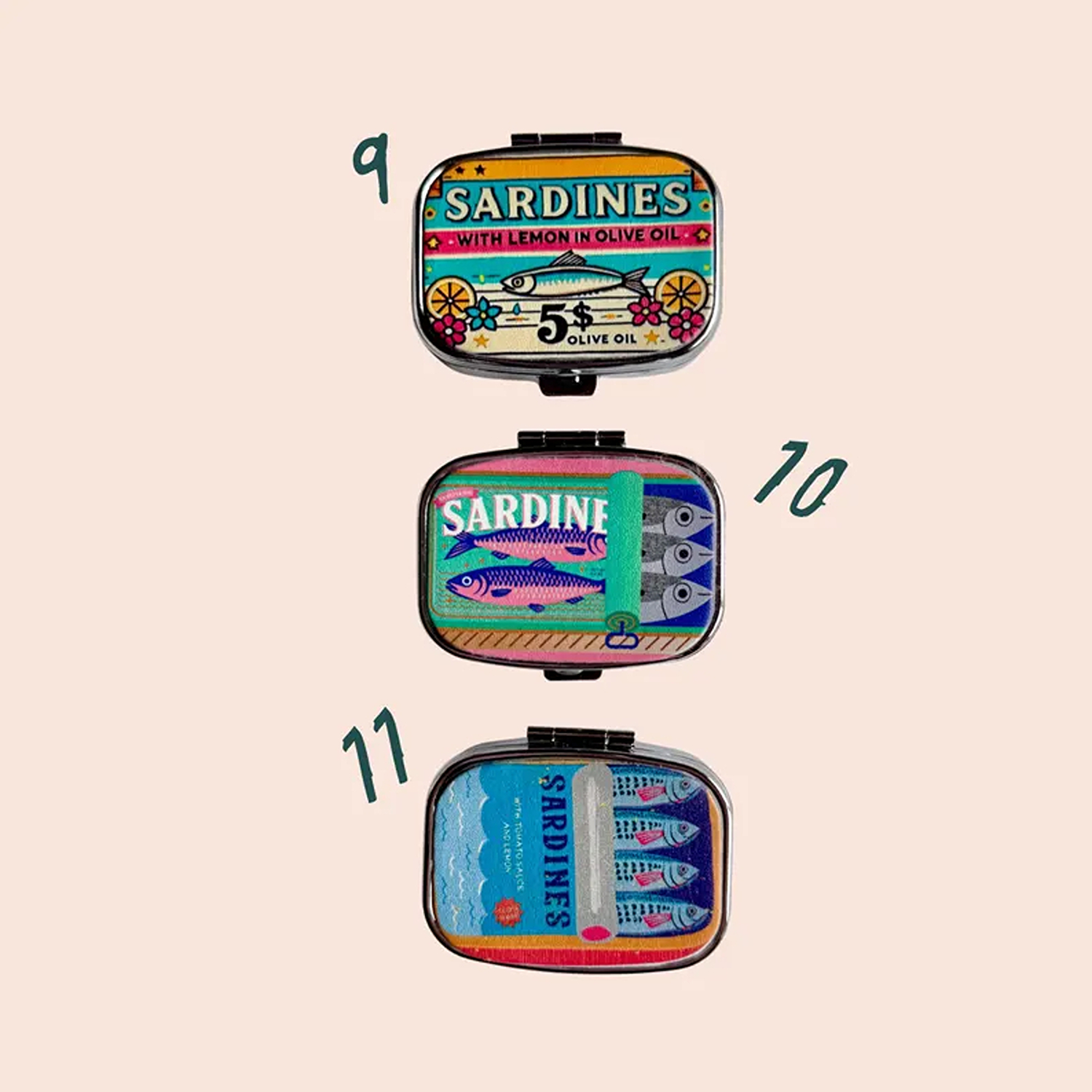 Pastillero de Sardinas : Un divertido pastillero de estilo retro, diseñado para parecerse a una lata de sardinas clásica. Es práctico y divertido, perfecto para mantener los medicamentos organizados con una sonrisa.