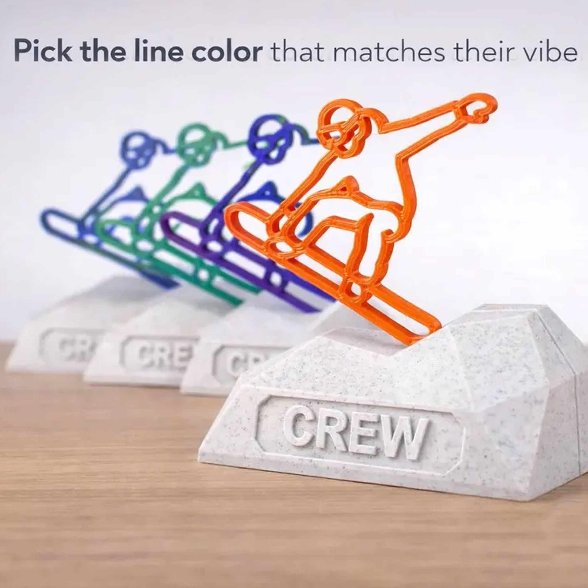 Trofeo Escultura de Snowboarder : Una decoración de escritorio dinámica que presenta a un snowboarder estilizado en el aire, elaborado con una línea de colores vibrantes. La figura está montada sobre una base texturizada con forma de pico de montaña para un impacto visual impactante.
