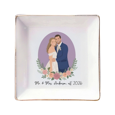 Diseño artístico de retrato en acuarela : este plato cuadrado para joyas presenta una delicada ilustración en acuarela, con sutiles detalles florales y texto nítido. Su estilo minimalista realza un retrato familiar o de pareja personalizado, otorgándole a la pieza una presencia serena y elegante que destaca en cualquier tocador o mesita de noche.