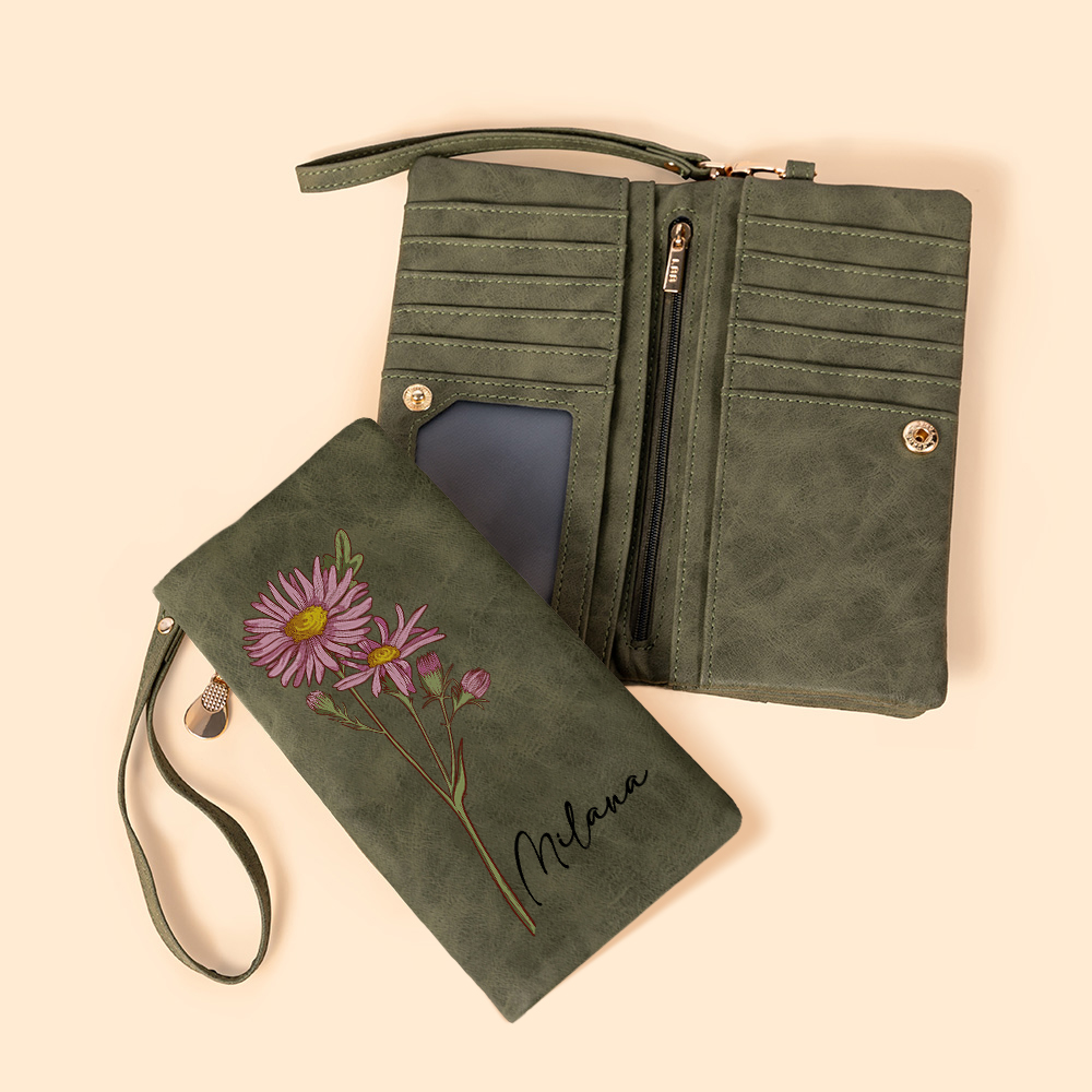 Toque personalizado : esta billetera presenta un encantador diseño de flor de nacimiento de acuarela que se puede personalizar con un nombre, creando un artículo único y significativo que refleja el estilo personal.