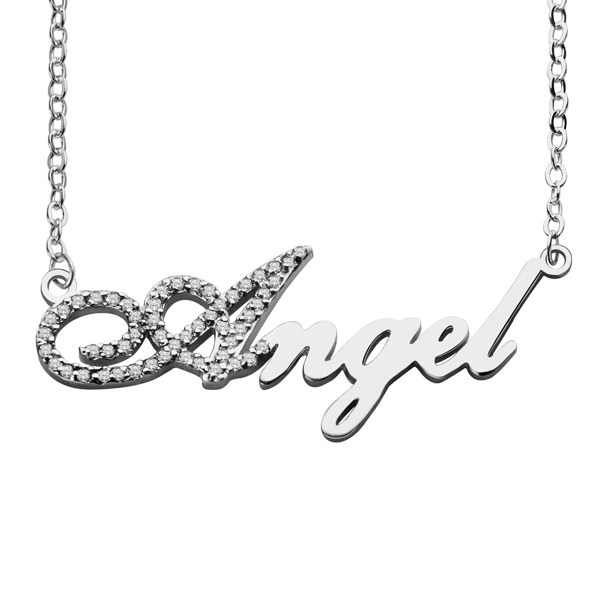 Tan divino como un ángel, el collar con nombre caligrafiado tiene piedras de nacimiento que hacen brillar la primera letra de su nombre.