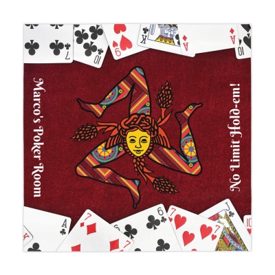 Diseño vibrante : Este llamativo mantel luce el icónico emblema de Trinacria, complementado con un vibrante motivo de naipes. Aporta un toque de estilo siciliano a tus reuniones de juego, lo que lo hace perfecto para noches de póker o partidas de cribbage.